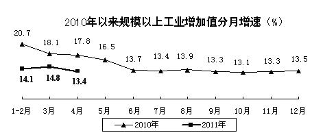 近日,工业和信息化部运行监测协调局、中国社会科学院工业经济研究所联合发布了《2011年中国工业经济运行春季报告》。全文如下: 2011年中国工业经济运行春季报告 今年是“十二五”开局之年,工业系统认真贯彻落实党的十七届五中全会和中央经济工作会议精神,按照“十二五”规划总体要求,以科学发展为主题,以加快转变经济发展方式为主线,坚持扩大内需,努力扩大出口,加大结构调整力度,推进“两化”深度融合,促进工业转型升级,工业经济继续呈现生产增长较快、效益同步改善、出口加快恢复的良好格局。 一、今年以来工业经济运行主要特点 ——工业生产保持平稳较快增长。1-4月,全国规模以上工业增加值同比增长14.2%,增速同比回落4.9个百分点,比去年三、四季度分别加快0.7和0.9个百分点,其中轻、重工业增加值同比分别增长12.9%和14.7%。分管理门类看,原材料工业、消费品工业、装备制造业、电子制造业增加值同比分别增长12.5%、14.2%、17.1%和15.2%,增速同比分别回落5.7、1.4、8.2和6.5个百分点。