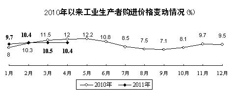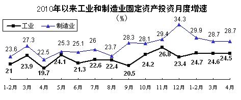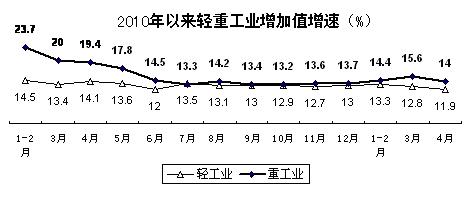 ——中小企业经营状况继续改善。1-4月,规模以上中小型企业完成工业增加值同比增长16.7%,增速比全部规模以上工业快2.5个百分点。实现利润9148亿元,同比增长37.3%;上缴税金5435亿元,增长32.7%;利润和税金分别占全部规模以上工业比重的61.5%和50.5%。 ——工业投资结构有所优化。1-4月,工业固定资产投资同比增长24.6%,其中制造业投资增长29%。在宏观调控和市场因素双重作用下,六大高耗能行业投资同比增长13.7%,增幅较去年全年增速下降1.1个百分点,低于同期工业投资平均水平10.9个百分点。装备制造业、高技术产业投资保持较快增长,通用设备、专用设备行业投资分别增长28.2%和28%,电气机械及器材行业投资增长54.1%,医药行业投资增长37.2%,通信设备和计算机行业投资增长55%。