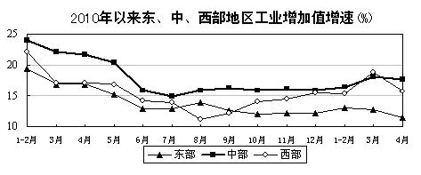 ——区域发展协调性增强。在有序承接产业转移带动下,中西部地区增长潜力加快释放。1-4月,东、中、西部地区规模以上工业增加值同比分别增长12.6%、17.5%和16.4%,比去年四季度分别加快0.5、1.6和1.7个百分点;中西部地区工业增加值在规模以上工业中所占比重进一步上升到41.5%。效益水平同步提高。东、中、西部地区规模以上工业实现利润同比分别增长25.1%、38.5%和35.5%。
