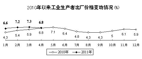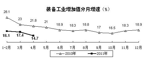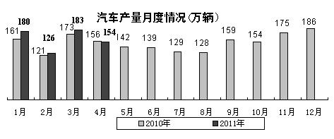 从原材料价格看,在需求拉动和资金逐步趋紧的情况下,有可能价格会反复波动。4月末钢材综合价格指数为134.73,比上月末提高2.78点。国内市场铜、铝现货月度平均价格分别为71576元/吨和16610元/吨,比上月平均价格高387元/吨和71元/吨。4月份,主要化工产品市场价格整体延续上涨态势。据石化工业联合会统计,硫酸、天然橡胶月均价格分别为610元/吨和39190元/吨,同比分别上涨17.3%和53.1%。重点建材企业水泥平均出厂价378元/吨,比去年同期上涨29.3%;平板玻璃平均出厂价比去年同期下降1.8%。当前原材料行业面临的主要问题是:一是提前出现的局部用电紧张和节能减排压力,会影响原材料行业开工率和正常生产;二是库存较高;三是完成结构调整任务艰巨,钢铁、有色、水泥等行业过剩和落后产能仍大量存在。 ——装备行业总体保持较快增长,汽车产销增速开始回落。大力推动结构调整和优化升级,给装备制造业的发展带来新的机遇。1-4月,规模以上装备工业增加值同比增长17.1%,同比回落8.2个百分点,比一季度减缓0.7个百分点。其中,通用、专用设备同比分别增长21.6%和23.3%,仪器仪表及文化办公设备和电气机械及器材制造业分别增长17.9%和16.9%,交通运输设备制造业增长13%。另据海关统计,1-4月,全国机电产品出口3198亿美元,同比增长22.9%。