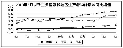 数据来源:美国联邦储备委员会、欧盟统计局、日本经济产业省、日本内阁府。 注:2011年第二季度的数值为预估值。 通胀压力正在从新兴经济体向发达经济体扩散,国际市场大宗商品价格高位攀升,通胀压力加大可能会对世界经济复苏带来冲击。4月份,美国生产者价格指数同比上升6.8%,巴西、印度、俄罗斯分别达到13.3%、9%和20.9%,韩国达到6.8%,均处于较高水平。布伦特原油每桶现货平均价格达到123.5美元,近期虽有回落,仍保持在110美元以上水平。4月末,芝加哥商品市场大豆、小麦价格达到13.58美元/蒲式耳和7.53美元/蒲式耳,均处在历史最高水平。