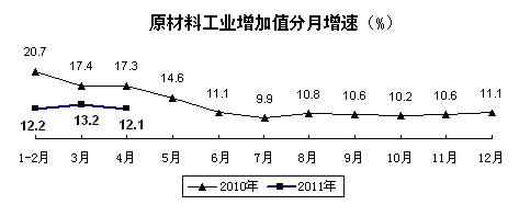 三是资源能源供求仍将处于紧平衡状态,节能减排压力大。当前我国仍处于工业化、城镇化加速期,交通、住房、电力等设施建设对能源、原材料的需求呈刚性增长。资源供给的有限性和需求的刚性增长决定了化石能源和电力等将长期处于“紧平衡”状态。特别是在当前各地投资热情高涨、高耗能行业有抬头迹象的形势下,完成节能减排和结构调整难度加大。工业是我国能源消耗和污染物排放的主要领域,节能减排重点在工业,难点也在工业。根据“十二五”规划纲要要求,初步确定,2015年单位国内生产总值能耗、单位国内生产总值排放二氧化碳、单位工业增加值用水量分别比“十一五”末降低16%、17%和30%。落实“十二五”规划目标任务,今年国家下达的18个行业淘汰落后产能目标任务中,有10个行业比去年有较大幅度增加,工作任务十分艰巨。 三、工业主要行业运行趋势预测 今年是“十二五”开局之年,工业经济要在保持适度增长速度基础上,将更多精力放到结构调整和转型升级上来,为稳定当前物价总水平做出贡献,为加快转变经济发展方式奠定长远的基础和支撑条件。为此,工业和信息化部提出今年工业经济预期目标是规模以上工业增加值同比增长11%左右,大力促进节能减排,按进度完成淘汰落后产能工作。从工业主要管理门类看,主要行业运行特点和趋势如下: ——原材料行业受需求拉动仍将保持一定增长水平,但节能减排压力和电力紧张可能影响增速。1-4月,规模以上原材料工业增加值同比增长12.5%,同比回落5.7个百分点,比去年四季度加快1.9个百分点,其中4月份增长12.1%。粗钢产量2.3亿吨,同比增长8.3%;钢材产量2.8亿吨,同比增长12.6%。十种有色金属产量1091万吨,同比增长9.6%;其中,精炼铜产量173万吨,增长15.8%。化工主要产品中,烧碱、纯碱和乙烯产量分别为776万吨、724万吨和526万吨,同比增长17.8%、3.3%和31%。化肥生产由于成本上升继续减缓。全国农用氮、磷、钾化学肥料(折纯)产量1939万吨,同比增长4.8%,增速同比回落3.9个百分点。建材行业增速加快,水泥产量同比增长19.6%,商品混凝土增长30%,水泥排水管增长50.3%,平板玻璃增长17%,建筑用砖增长48%。建材行业加快增长主要是受房地产、基础设施投资拉动。1-4月,房地产投资1.33万亿元,同比增长34.3%,也就是说比去年同期多投资3400亿元,全年投资将达到4万亿元,直接拉动了建材产品生产加快增长。投资是拉动原材料工业增长的主要动力,随着“十二五”新项目的开工建设,特别是保障性住房建设和国家鼓励培育发展战略性新兴产业配套政策逐步落实,今年全年工业投资总体增速仍将保持在25%左右。预计上半年原材料行业增加值同比增长11%-12%。