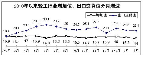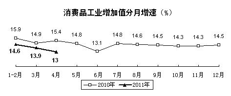 受国家加大基础建设和支持“三农”政策利好带动,挖掘机、压实机械产量分别为8.8万台和2.8万台,同比分别增长52.8%和33.9%;装载机产量为9.8万台,同比增长40.2%。农业机械产量保持平稳较快增长,大型拖拉机产量1.4万台,同比增长19.5%;中、小型拖拉机产量分别增长20.2%和12.5%;收获机械产量同比增长51.5%;收获后处理机械产量同比增长29.2%。虽然4月份汽车产销量环比有所下降,但前4个月汽车产销量分别达到643万辆和653万辆,同比增长5.1%和6%。国家大力发展高端装备制造业、新能源产业,加快高速铁路建设,装备工业发展具有较大的市场空间和持续的动力。总体估计,上半年装备工业增加值同比增长16.5%左右。 装备行业运行中突出问题表现在:一是造船市场开始萎缩。今年前4个月,我国造船企业月均新接订单仅为340万载重吨,大大低于去年627万载重吨的月均新接订单水平,其中3、4两个月新接订单分别为265万载重吨和271万载重吨;手持船舶订单持续下降,截至4月底我国造船企业手持船舶订单量为18376万载重吨,比上年末下降6.2%。今年以来,随着船舶市场需求变化,约有半数规模以上船舶企业尚无造船合同成交,个别企业处在船台空置、无船可造的状况,全行业亏损企业亏损额有所增加。二是成本上升压力加大。以造船为例,4月底,国内市场造船所需中厚板价格指数达到141,比年初上升8.7点;平均价格达到5034元/吨,比年初上涨321元/吨,涨幅为6.8%。同时,与年初相比,船舶企业劳动力成本平均上升15%。多种因素叠加,导致船舶工业成本上升压力加大,利润率下降。 ——消费品行业将继续稳定增长。1-4月,规模以上消费品工业增加值同比增长14.2%,同比回落1.4个百分点;其中4月份增长13%。轻工行业增加值同比增长15.4%,同比回落1.2个百分点;纺织行业增加值同比增长9.9%,同比回落3.2个百分点。农副食品加工、食品制造和饮料制造行业增加值同比分别增长12.9%、15.3%和17%;医药行业增加值同比增长16%,同比加快0.6个百分点; 烟草行业增加值增长14.2%,同比减缓0.1个百分点。主要产品中,纱产量846万吨,增长10.6%;布产量179亿米,增长15.7%;服装73.7亿件,增长13.5%。重点监测的12种家用电器产品中有5种产品产量增速超过20%,其中,空调器、洗衣机分别增长32.5%和31.9%。随着全国多个省份多次上调最低工资标准,居民收入增加特别是农村居民收入增加,更多鼓励消费政策出台,在国内消费支撑和出口回升形势下,消费增长仍将是带动工业经济上行的亮点。预计上半年消费品工业增加值增速稳定在14%左右。