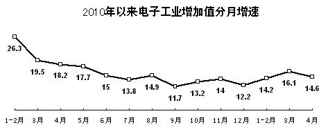 消费品行业许多中小企业的产品销售以国际市场为主,对人民币升值、利率提高等非常敏感。由于成本增加、汇率变动等多重因素,部分以出口为主的轻纺中小企业利润空间受到压缩,处于盈亏边缘,需要高度重视,避免出现停工、关闭等现象。据纺织工业协会统计,一季度纺织行业财务成本同比上升40.2%,远高于主营业务收入增速7.6个百分点。 ——电子行业生产进一步恢复,出口加快增长。1-4月,规模以上电子制造业生产加快恢复,增加值同比增长15.2%,同比回落6.5个百分点,比一季度回落0.1个百分点。主要产品中,微型计算机设备产量同比增长25%,其中笔记本计算机增长16.3%;手机产量增长14.5%;彩电产量下降3.8%,其中液晶电视机增长2.9%;集成电路产量增长32.1%。电子行业实现利润527.3亿元,同比增长2.3%。出口交货值保持较快增长,电子制造业出口交货值同比增长15.3%,比一季度回落0.2个百分点,其中4月份增长14.5%。另据海关统计,手机、彩电、计算机出口额分别增长48%、6.1%和7.6%。预计上半年电子工业增加值增速稳定在15%左右。