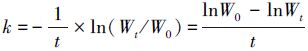 (3)由Olsen指数衰减模型Wt=W0e-kt [18, 19]进行自然对数转换,得出凋落物分解的质量衰减模型,据此推出,式中k为分解率常数,其他符号意义同上。并据此推算凋落物分解至50%、95%的时间t0.5和t0.95。